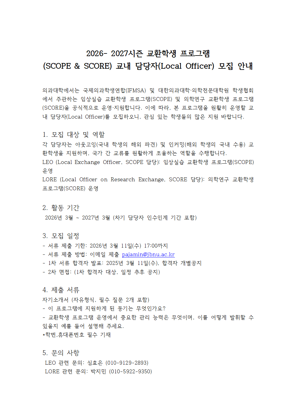 2026-2027 시즌 교환학생 프로그램(SCOPE & SCORE) 교내 담당자(Local Officer) 모집 안
